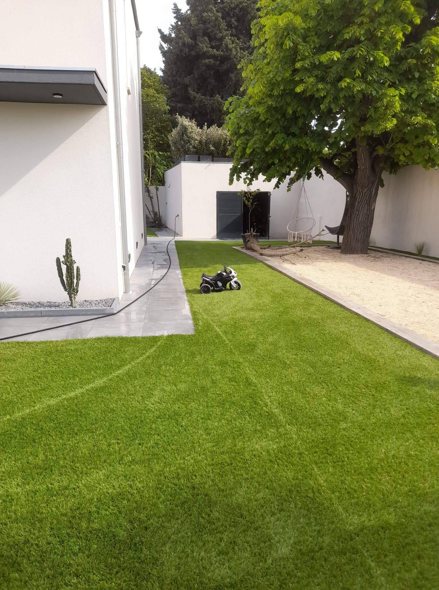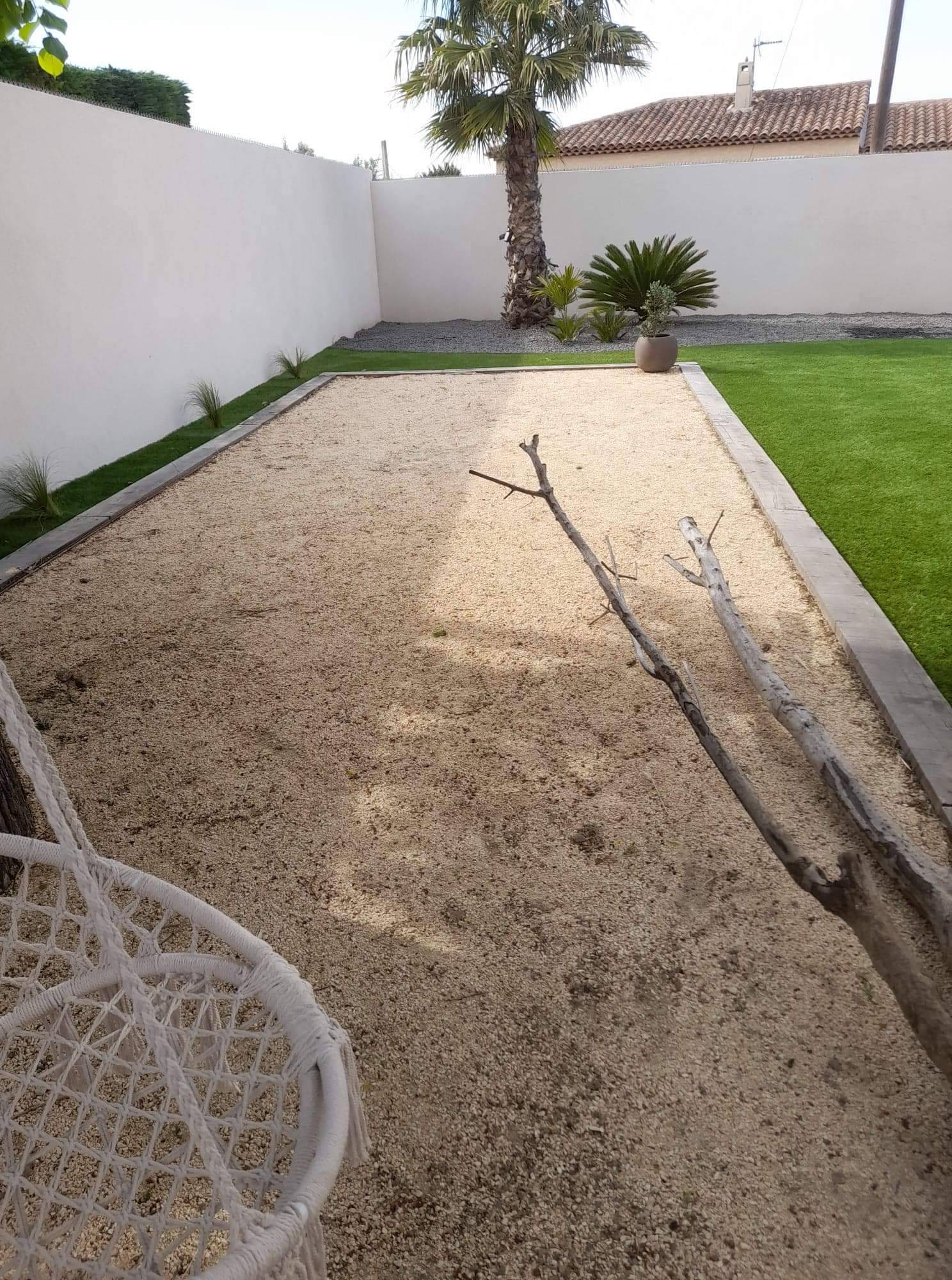 Le client qui a une maison récente a souhaité ajouter la création d'un terrain de pétanque pour en profiter pendant les beaux jours.